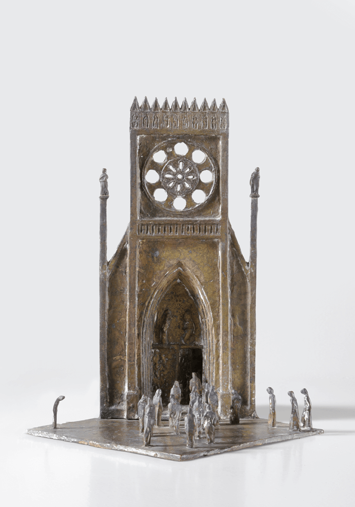 Eine zeitlose sozialkritische Arbeit ist die Bronzeskulptur „Kirchgang“. In der Haltung und Gestik der kleinen Menschendarstellung vor dem gotischen Kirchenportal spiegelt die tiefe bis scheinheilige Glaubenszugehörigkeit in unserer Gesellschaft wider. Als Abschluss seiner sakralen Arbeiten steht ein Tabernakel in der Form eines freistehenden Kubus unter dem Thema: „Ich bin Dein Gott, der Dich befreit hat.“